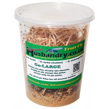 The standard size culture is suitable for those that have a few animals to feed. The Go-Large option was introduced to meet the demands of the serious frog breeder. Each culture has double the media (Drosophila Mix), in a pot that is double the size as the standard tub, resulting in double the production. The only thing we didn't double, was the price. So at an extra £1.50, you cannot go wrong.