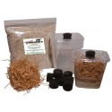 These kits comprise of the items seen in the main picture (except flies); containers, media and excelsior (wood wool) + instructions. With enough supplies to made 10 cultures.